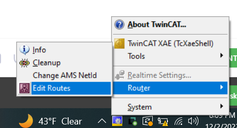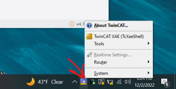 <figure><img src="https://3704730939-files.gitbook.io/~/files/v0/b/gitbook-x-prod.appspot.com/o/spaces%2F4lSQNVI3DZ15V7kjkMCA%2Fuploads%2FaIbg2zg2HQckybCojKRu%2Fimage.png?alt=media&#x26;token=ae93bb14-41af-4f8d-b97c-e764b71017a2" alt=""><figcaption><p>If the icon is not visible, ensure you have installed TwinCAT 3. If you have TwinCAT 3 and still cannot see the icon, it may be nested inside the icon tray's caret -- ^</p></figcaption></figure>