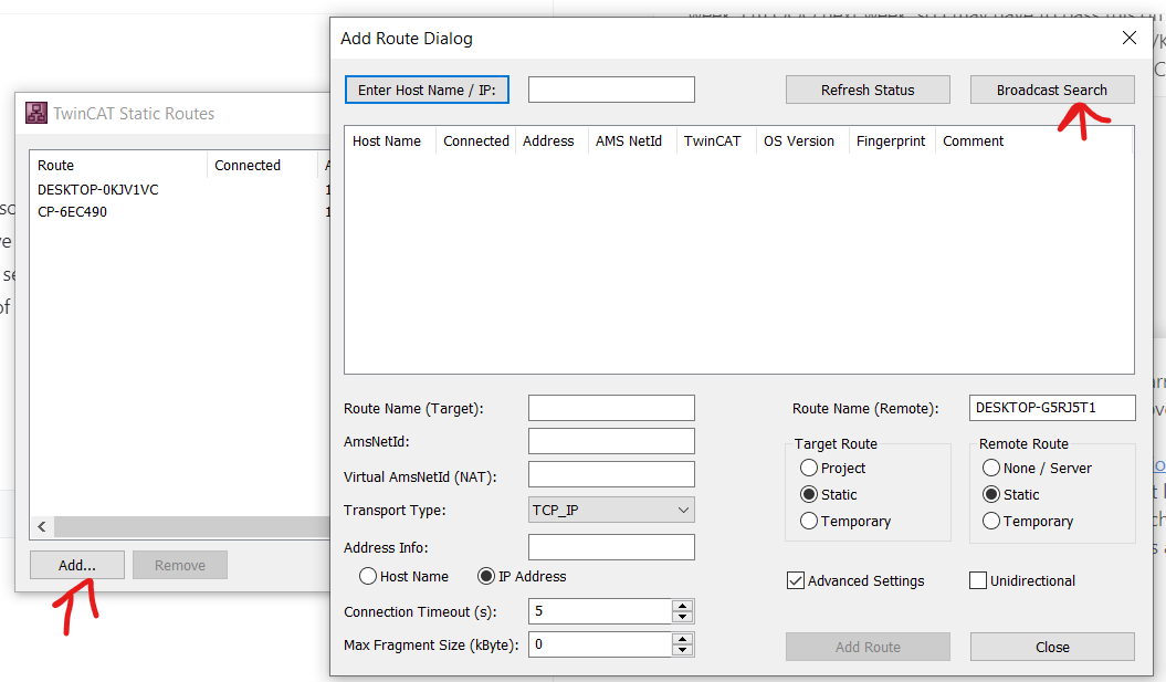 To back up a Beckhoff device, Beckhoff TwinCAT requires a preconfigured route from the agent machine to the device. The devices may be on the same physical network before this step, but without setting this up they can't do anything that requires TwinCAT communications, like a backup. Here are the necessary steps: