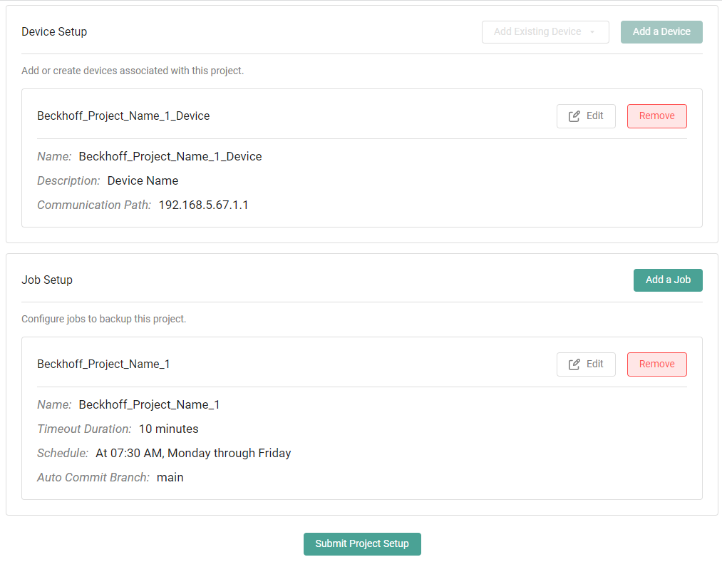 Once complete, press *Submit Project Setup* to create the Project, Device(s) and Job(s).