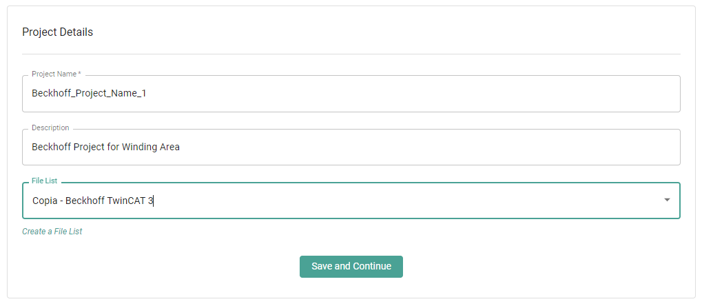 The project details allows you to update the Project name, and description if desired.  In addition, you will need to select the filelist for a Beckhoff TwinCAT 3 backup.  This tells Copia what to copy when making a backup.  Copia has provided a recommended default filelist that you can select, or you can choose to create your own. &#x20;