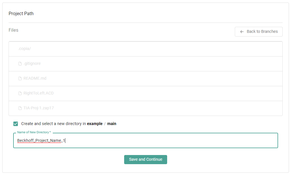 For Beckhoff TwinCAT3, you can either select an existing project folder, or create a new empty project folder (so that you can upload a copy from the device) for an initial revision.  You can make this choice after you have selected the repository and branch for the project folder.&#x20;