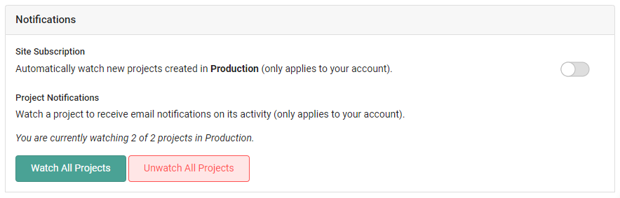 In this section you can enable watching all projects in a site, and subscribe to watch new projects for a site. &#x20;