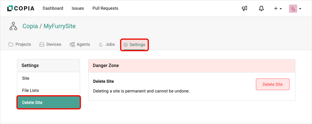To delete a Site, navigate to the *Settings* tab for a given Site and click on the *Delete Site* section.