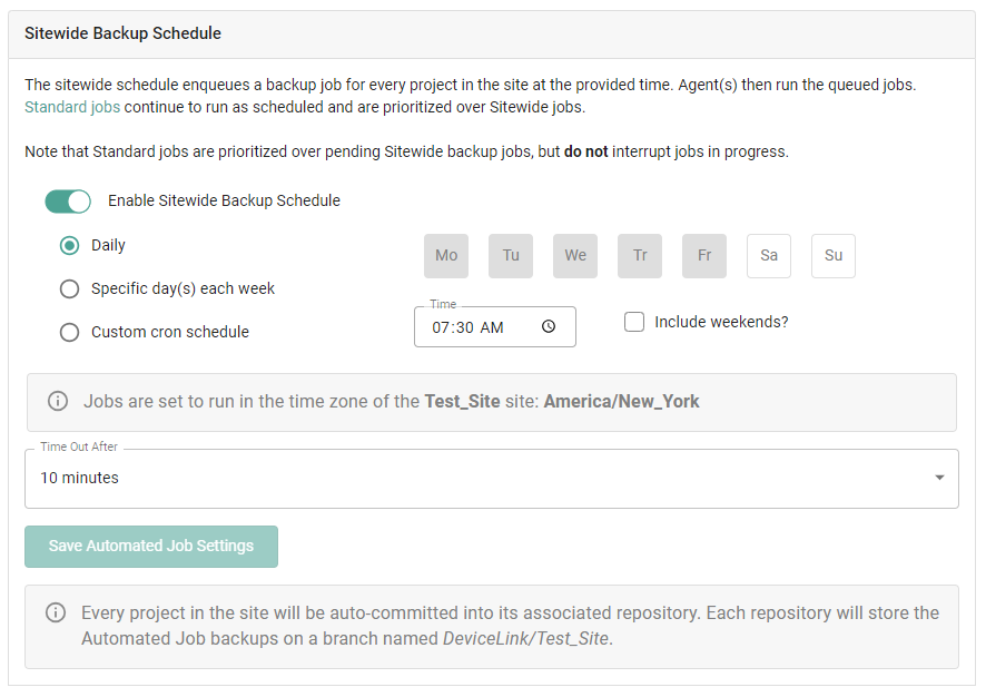 A sitewide job backs up all the projects in a site. At the scheduled start time, a job run for each project will be queued and run in order. This ensures all projects are backed up, without having to configure a job for each project manually.  More information about this and other jobs can be found in the [Creating Jobs](https://docs.copia.io/docs/devicelink/jobs/creating-jobs) section. &#x20;