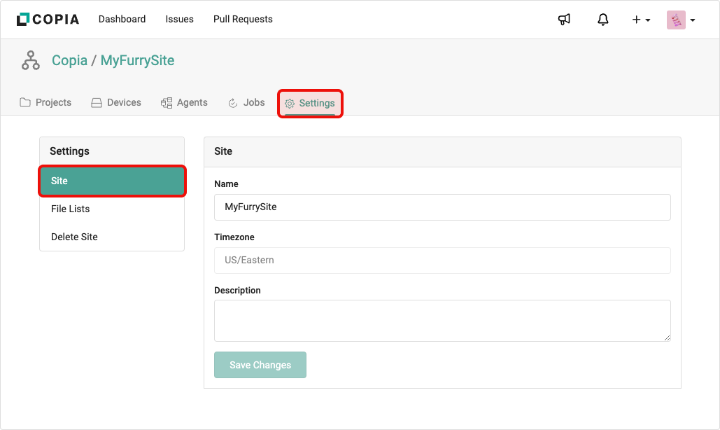 To modify a Site, navigate to the *Settings* tab for a given Site and click on the *Site* section. After updating the Name and Description fields, click the *Save Changes* button.