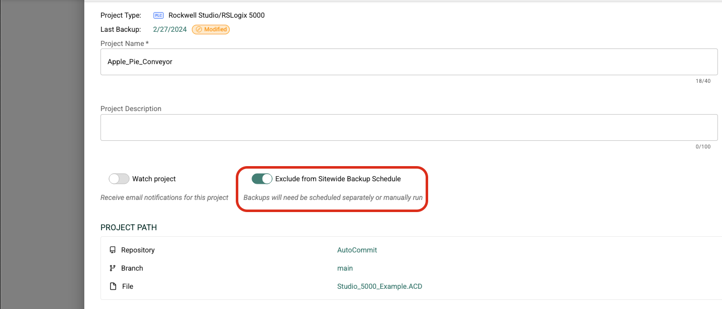 Projects can be excluded from a sitewide backup schedule on an individual basis. Activating this feature can be useful if you are running a sitewide backup schedule but want to exclude a project from that schedule for any reason (for example, to reduce backup failures when you expect a Project to be offline due to extended maintenance or upgrades). To exclude a single Project from a sitewide backup schedule, open the project detail view and enable the "Exclude from Sitewide Backup Schedule" toggle.&#x20;