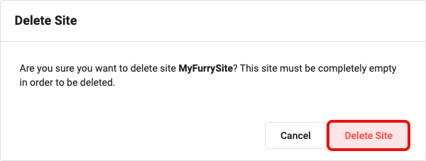 <figure><img src="https://3704730939-files.gitbook.io/~/files/v0/b/gitbook-x-prod.appspot.com/o/spaces%2F4lSQNVI3DZ15V7kjkMCA%2Fuploads%2FwO1uB2oNdZC4JGk2laoZ%2FWebApp_SiteSettings_ConfirmDeleteSite.png?alt=media&#x26;token=255b2dd7-7d06-47c7-8063-3c0fff427997" alt=""><figcaption></figcaption></figure>