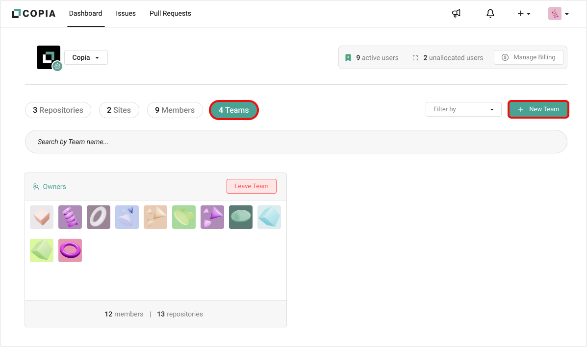 Navigate to the home page of your Copia organization and open the "Teams" page. Select the "Create New Team" button.
