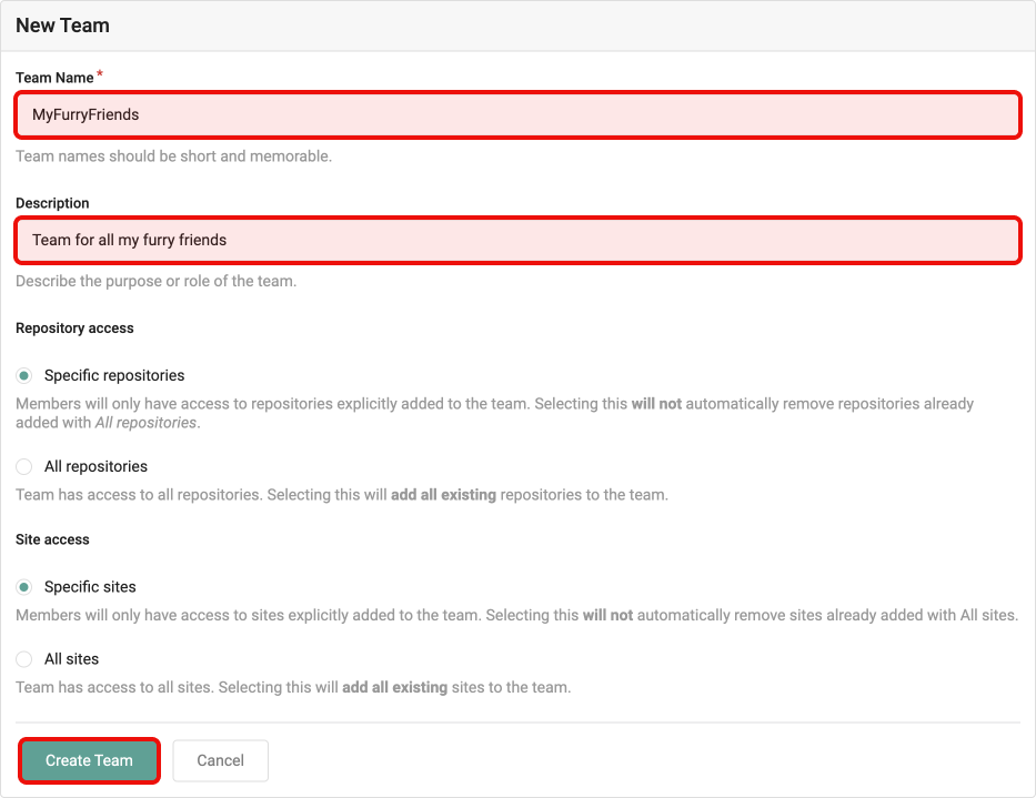 Once you've created a Team and assigned its Members, you can grant that Team access to a specific set of repositories.
