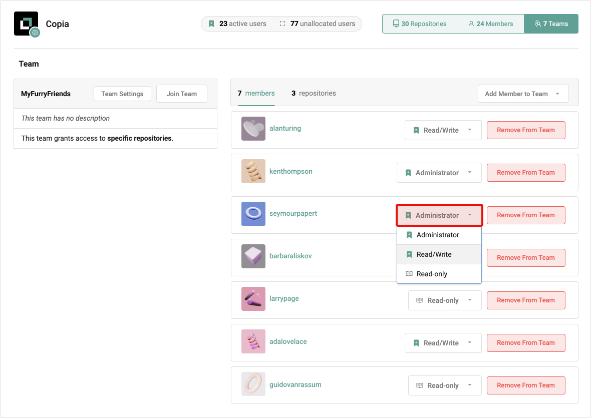In Copia, users can have one of three permission levels (Read, Write, or Administrator) that are set on a team level.