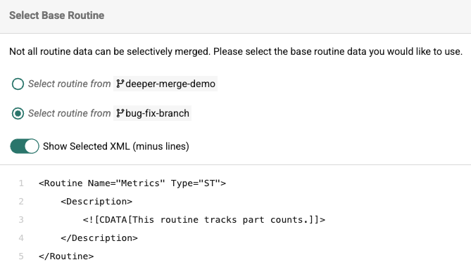 While the Advanced Merge Tool allows you to make individual selections within each Routine, there are certain Routine modifications, such as the Routine description, that can't be resolved at a granular level. For this reason, the Advanced Merge Tool requires you to make a selection, as shown in the image below. You must toggle one of the branch names. Toggling the "Show Selected XML" toggle will reveal the raw XML of the base routine you have selected. Note that this selection only applies to the non-logic components of the routine. Your individual selections of lines or rungs is not overwritten with this Base Routine selection.