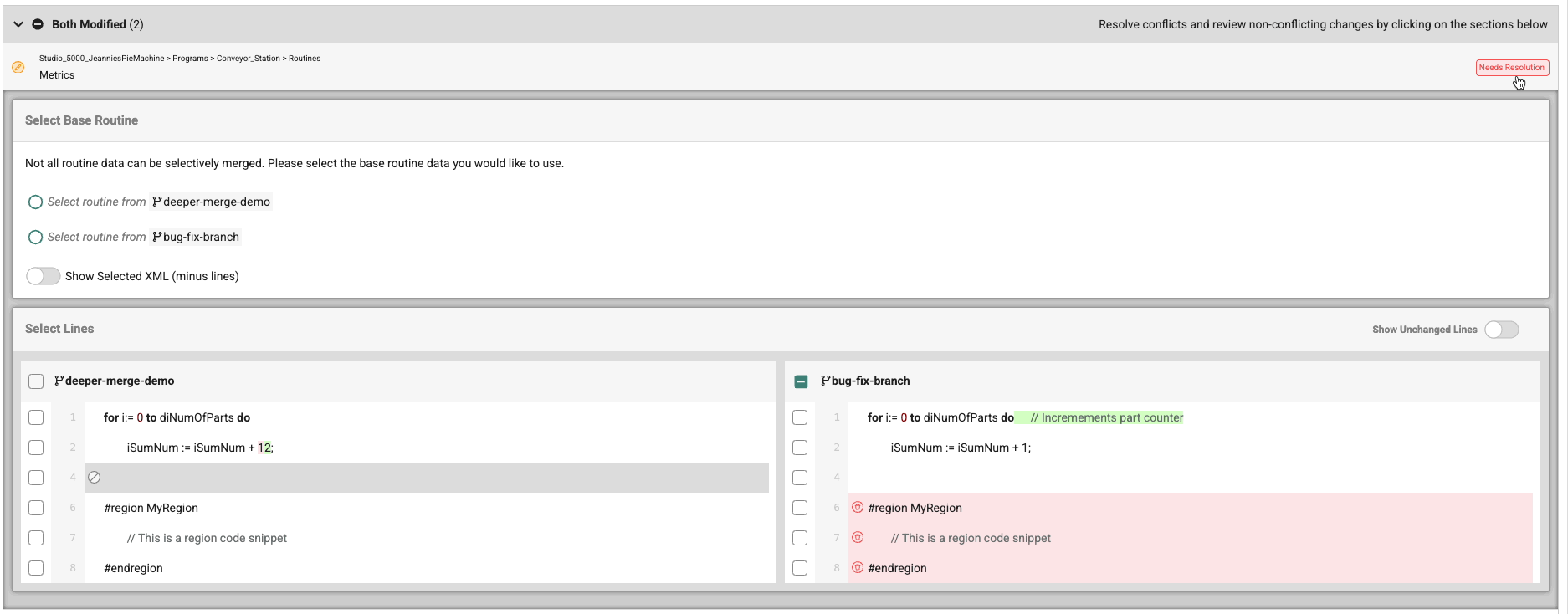 Conflict resolution within Routines is available for Ladder Logic and Structured Text Routine. When merging logic changes within the same Routine, the Advanced Merge Tool allows you to make individual line or rung selections for either or both branch versions for Routines written in Ladder Logic or Structured Text.