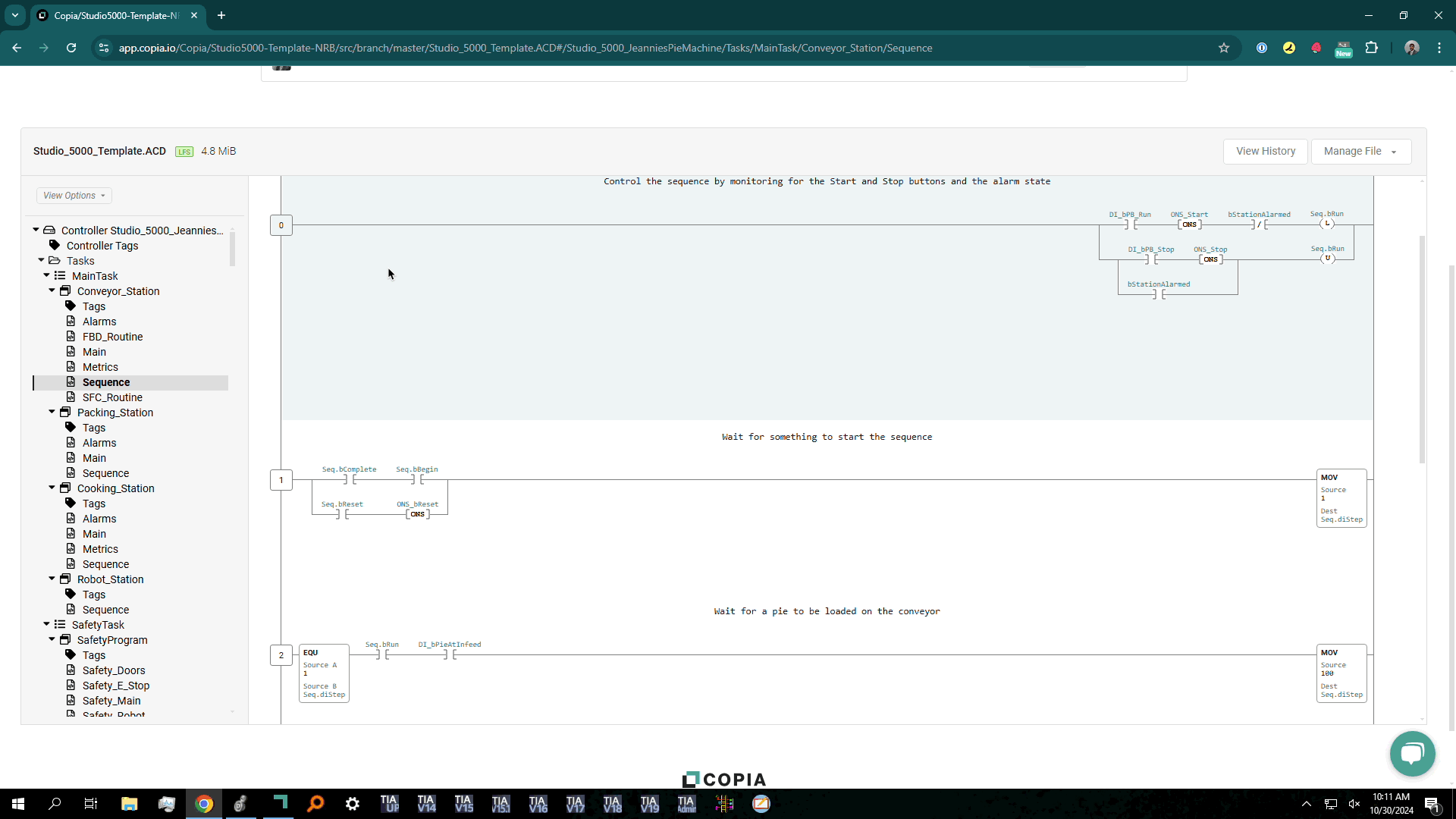 Copia's PLC file viewer allows you to select an individual rung to copy the Neutral Text representation of that rung to your keyboard. You can then paste that directly into the IDE to recreate the rung. This can save significant time in those scenarios in which you want to borrow a rung or two from another Rockwell PLC project that's already in a Copia repo because you can skip the steps of downloading the file, waiting for the IDE to open the project, and then copy/paste.