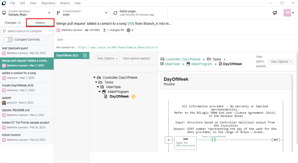 A particularly important benefit of Git is that it provides a meaningful history of file changes. With Copia, you can access your historical commits and even perform compares between commits.